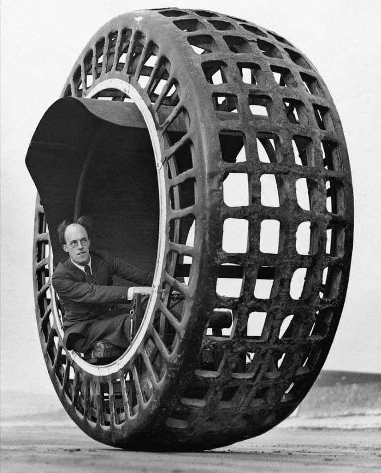 England 1932: The Dynasphere was a monowheel vehicle powered by an electric or petrol motor. The entire outer cylinder rotated and moved the vehicle while the driver and the motor were stationary inside. The weight of the motor and driver gave it a low center of gravity. More photos: The bizarre Monowheel seen through vintage photographs, 1930-1940 - Rare Historical Photos