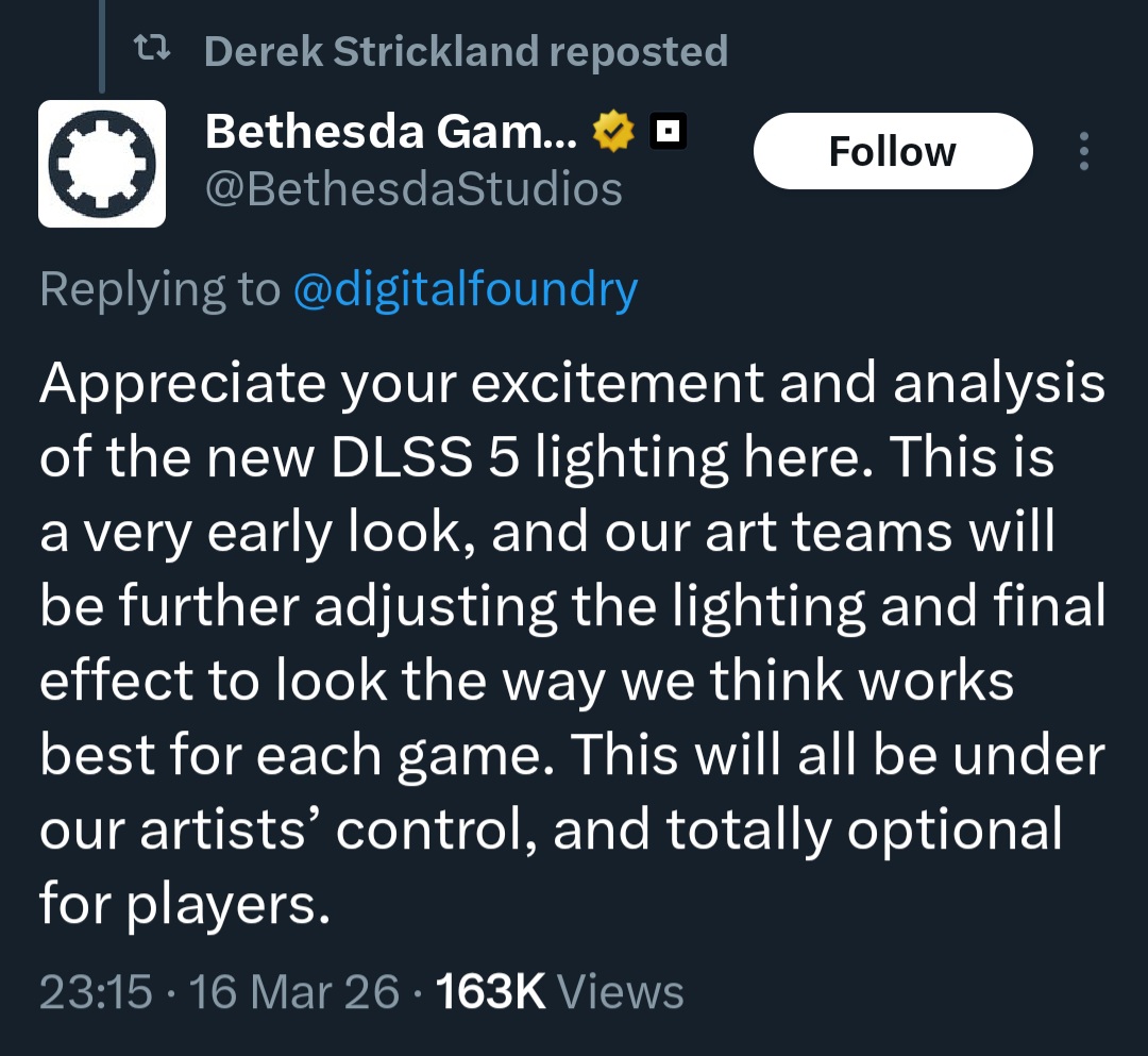 A sta ako je samo human sllop vs AI slop. Sta ako je protektivizam “kreativne” industrije koja kroz ovakve stvari pokusava samo sebe da zastiti a na stetu igraca. Gledas samo jednu stranu, koliko ti tehnologia menja “grejs” a nije bio problem umetanje piksela, nije problem umetanje frejmova, kroz frame generation… secam se vrlo dobro te iste Bethesde koja je nedavno tvrdila da je “vizija” 30 fps za Starfield, pa su onda posle godinu dana izdali 60 fps patch za konzole i odjednom gle! nije vise “vizija”.. Negde treba podvuci granicu, ali gde.. roustuju jedan zanimljiv tech i pecaju se ljudi… a slop je.. samo ne onaj koji izgleda.. pritom za PC imas milion community modova koji menja sve i svasta u igri, da vidis na sta lici GTA danas, ili Baldurs Gate koliko je modovan… ostalo je 0 od “vizije”… igra ti da alate i frejmvork da se igras dalje sa izgledom kako hoces… znas kako danas izgleda Skyrim, sta je trebalo da igramo zauvek onaj njihov mess od pre 20 godina?