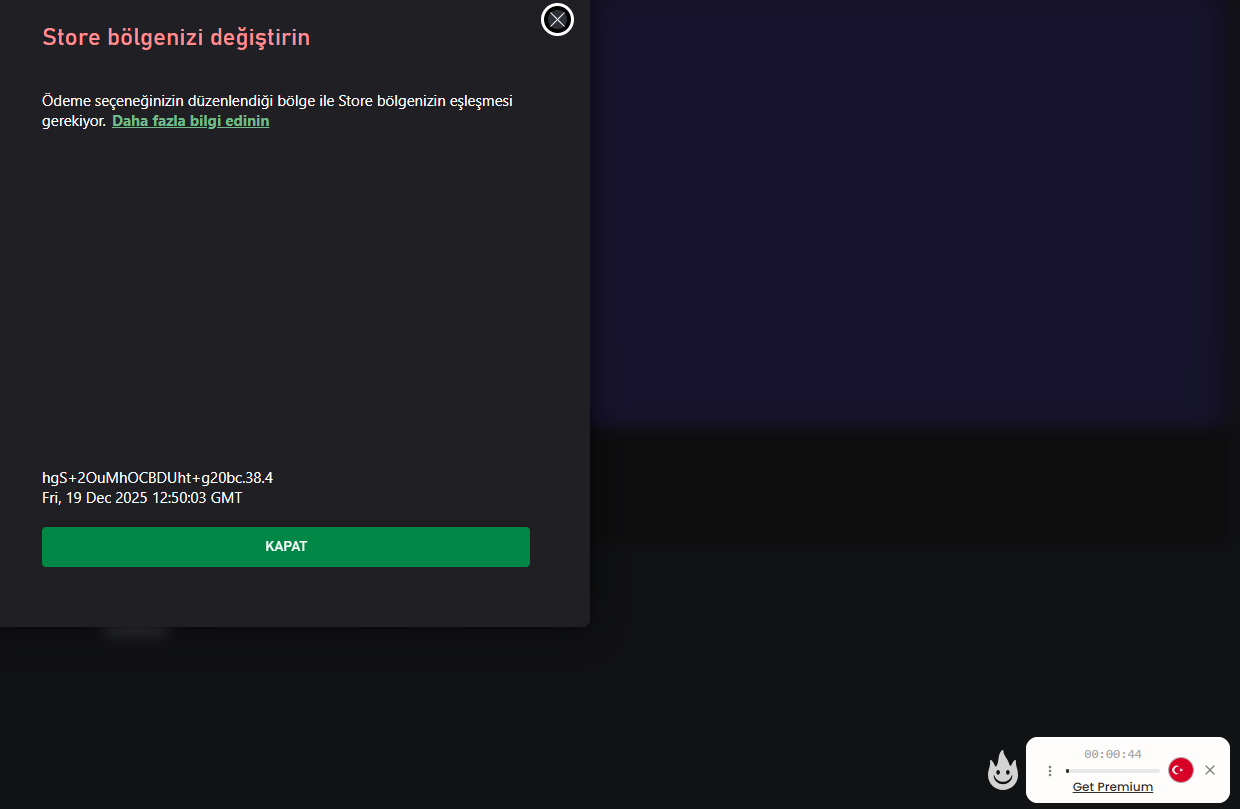 Meni izbacuje error čim otvorim redeem stranicu, znači prije nego što uopće mogu unijeti kod. Zanimljivo je da mogu otvoriti stranicu ne samo kad je isključen vpn, nego i kad sam spojen na druge regije. Samo Turska ne radi.